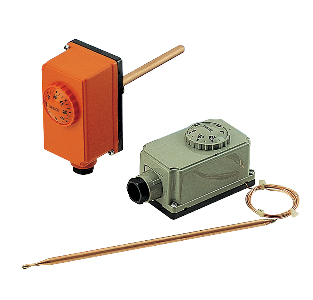 : termostato a immersione inscatolato con coperchio bianco – sonda a dilatazione di liquido – unipolare – regolazione esterna – sicurezza positiva per rottura capillare – guaina di protezione a tenuta stagna da 80 mm – attacco filettato maschio gas ½” – omologato ENEC 03 e CE 0497.